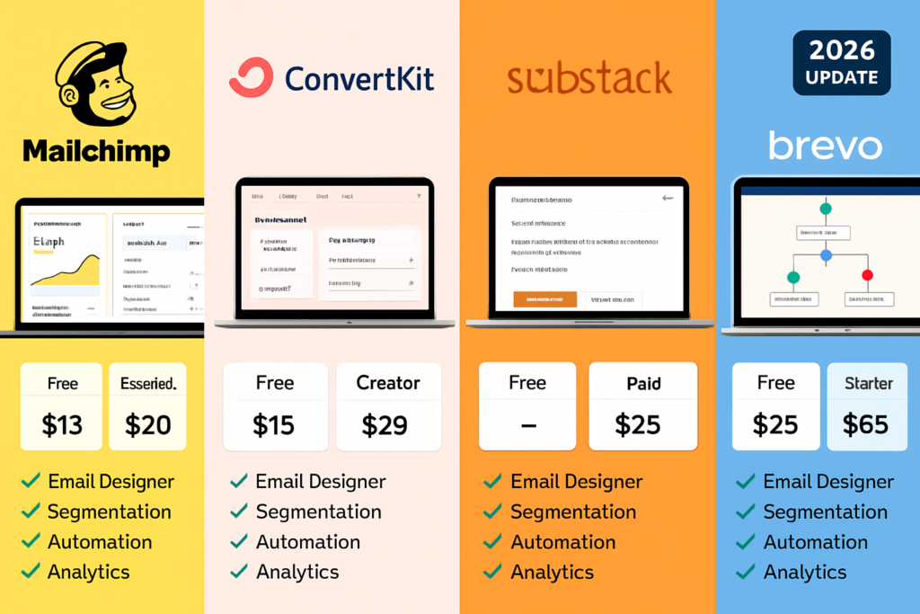 Si estás buscando la mejor comparación de plataformas de marketing por correo electrónico: Mailchimp, ConvertKit, Substack y Brevo, has llegado al lugar correcto. En 2026, el panorama del email marketing ha evolucionado dramáticamente, con nuevas funcionalidades de IA, mejores integraciones y modelos de precios más transparentes. Esta guía actualizada te ayudará a tomar una decisión informada basada en tus necesidades específicas.