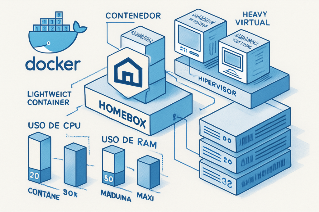 Ahora hablemos de Docker, la tecnología que hace que ejecutar HomeBox sea pan comido. Si nunca has usado Docker, déjame explicártelo de manera simple: imagina que puedes empaquetar una aplicación completa con todo lo que necesita para funcionar en una “caja” portátil. Esa caja se puede mover a cualquier computadora y funcionará exactamente igual.